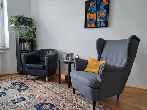 Der angenehm helle Praxisraum, ruhig im 3. Stock gelegen, angenehme Altbau-Höhe, hier lässt es sich gut und sicher mit Einzelpersonen, Paaren, kleineren Teams und Gruppen arbeiten.